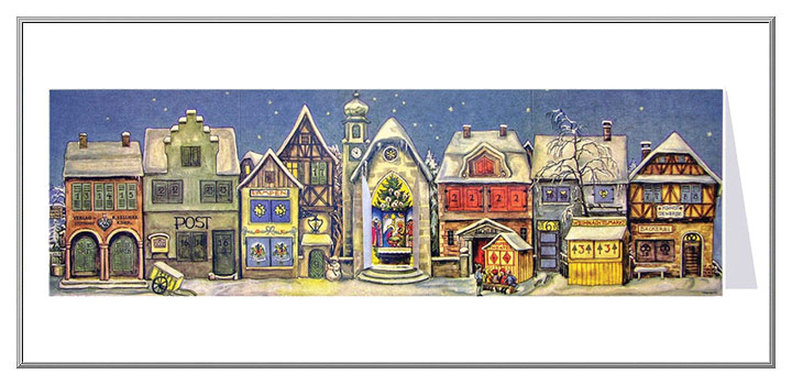 This historic Advent calendar was the first image published by the family firm Richard Sellmer Verlag in 1946, and was presented to General Eisenhower. Depicting a peaceful little town at night, the doors and windows of the buildings open to reveal the town's inhabitants at work, play, and naturally making ready for Christmas, too! Card is blank inside for your own message. Our import from Germany.