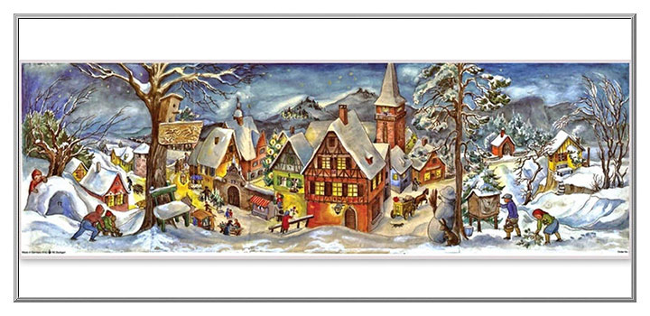 An evocative scene of Christmas time at twilight in a mountain village, our old time Advent calendar is a wonderful gift for friends or family. Made with 24 little doors that open, one a day, to reveal a hidden surprise image, it can be hung on a wall, or fold out the side panels to stand as a display piece. Sparkled with finest silver glitter accents, this colorful Advent calendar is from Germany.