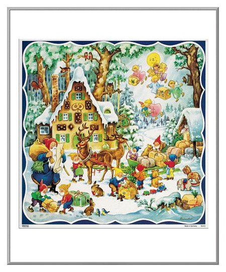 Santa is ready to go, but he's reading his list and checking it twice! Helped by sweet angels and his friends the forest gnomes, this charming design is bound to delight young and old alike. Created with 24 numbered windows, a different cute picture is hidden behind each tab. Reprinted from a vintage original, it is accented with shining silver glimmer. From Germany.