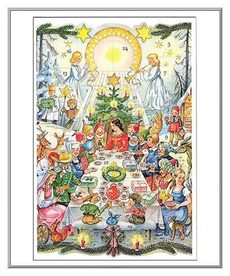 Wouldn't it be wonderful to be invited to Christmas dinner in Fairyland? All of the guests are so pleased to attend, and the tree with angels makes the event extra-special! This Advent card has 24 numbered little "doors" that you open, one every day, to reveal a tiny hidden picture. A colorful reprint of a vintage image, it's accented with the finest fairy sparkles. Card is left blank inside. From Germany.