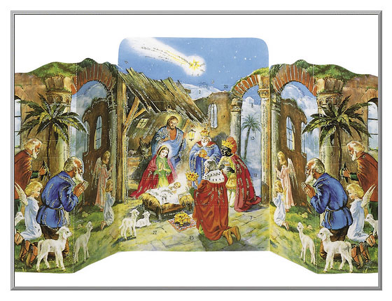 A wonderful way to count down the days until Christmas Eve, this vibrant picture depicts the Holy Family with worshiping angels and shepherds. Hidden behind each little numbered door is a different surprise image for the day. Colorfully printed on a satin finish cardstock, the die-cut standing calendar is highlighted with fine silver glitter. From Germany.