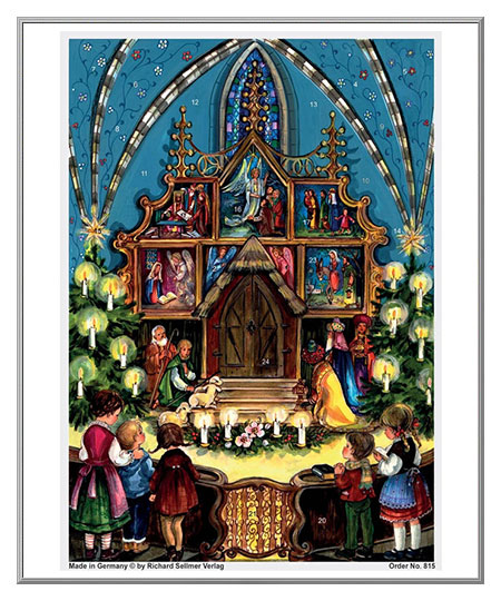 Quite a glorious sight to behold for the little ones, a holy nativity scene is set in front of a beautiful chapel altarpiece. An original Advent calendar design that dates to the '60s, each numbered little door opens to reveal a scene from the Christmas story. Glittered with accents of fairy sparkles, this colorful cardboard calendar is made in Germany.