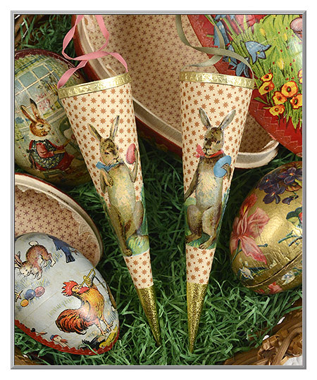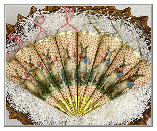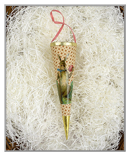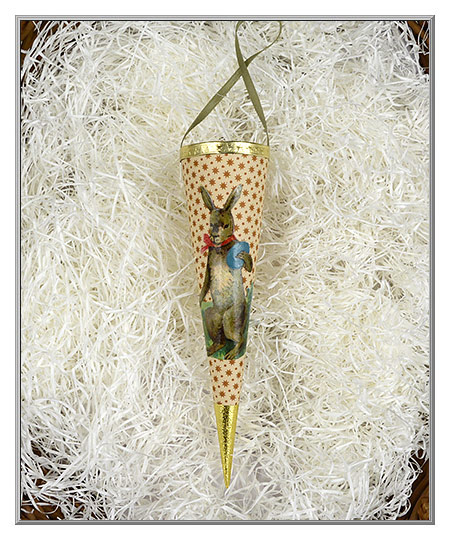 Made in the same manner as Victorian cone ornaments, we used only antique and old-style materials such as a starry patterned paper from Germany that is 90 years old, ribbon from the 20's, and genuine antique Mr. Easter Rabbit die-cut scraps that were printed in Germany in the early 1900's.