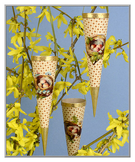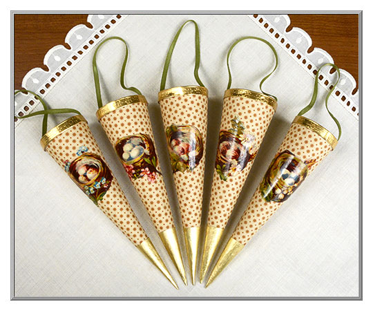 Our old-fashioned candy container cone is a traditional ornament that was quite popular in the late 1800's. A quaint custom was to fill the cornucopias with candies and small treats for the kiddies to discover on Easter Sunday - or on Christmas day, too! Please note that the antique nest scraps are unique, so each ornament is one-of-a-kind.