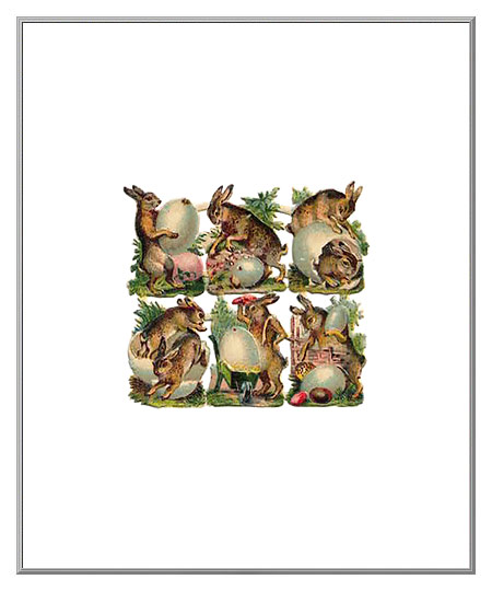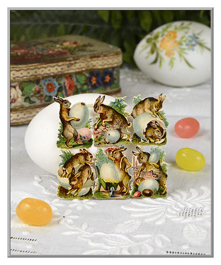 Rare paper ephemera from the past, these Victorian era die-cuts depict wee playful rabbits with Easter eggs. Nicely printed in clear, crisp colors, each of the six fanciful designs is the size of a standard postage stamp. Dating to the 1890's, the antique scraps were printed in Germany more than 125 years ago. Original old stock from our archives, they are still in wonderful, like-new condition.