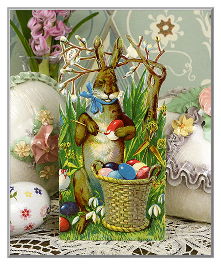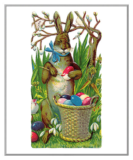 This fantastic piece of antique Easter ephemera is a Victorian-era treat for all lovers of treasures from the past. Still as bright and colorful as the day it was printed more than 125 years ago, this whimsical Easter rabbit scrap was made in Germany. Nicely embossed with fine detailing, the die-cut has a semi-gloss lacquer finish. Authentic old stock from our archives, the large paper scrap is in very good condition.