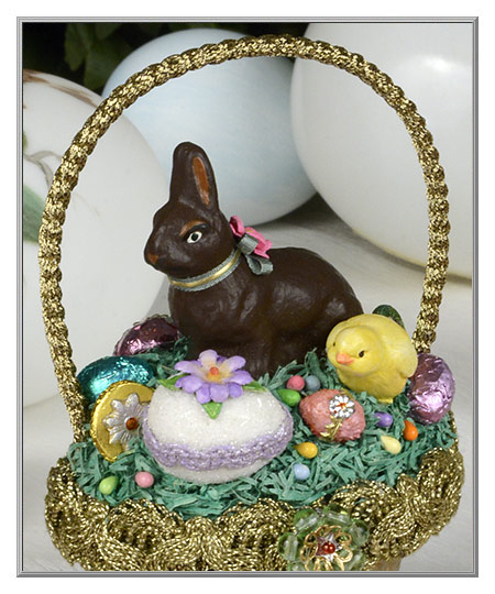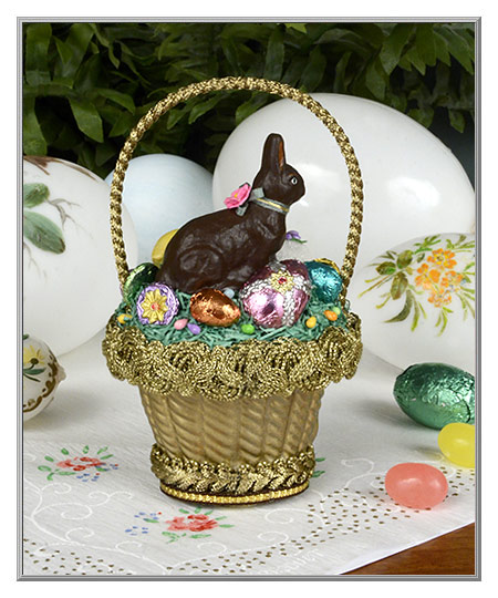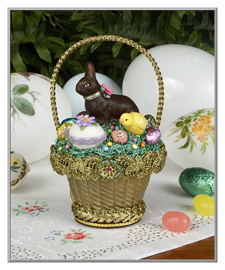 Like all of our Victorian Whimseys, we take great care to use only the finest vintage, antique or old-style materials. Featuring a blown glass basket that we had made for us in Germany, the fancy gold metallic trims were produced to our specifications by a German family-owned company. Every piece of Easter candy in the basket was crafted by our artists, including the sugar egg, baby chick and chocolate bunny.