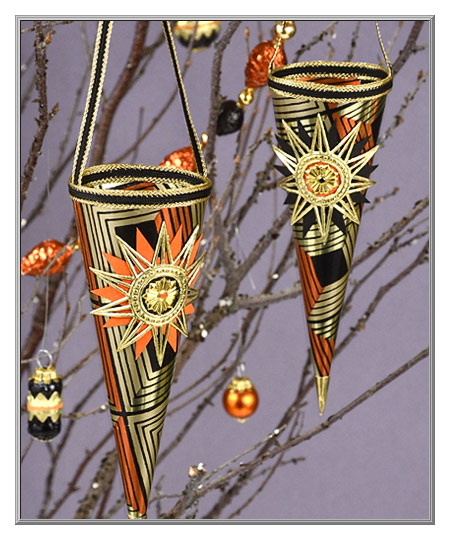 Inspired by 1920's Halloween favor gift cones, these striking ornaments are an exclusive from our atelier. Made using bold, vintage American-made foil paper of bright gold, black and orange, each cornucopia in the set features a radiant Dresden starburst as shown. Set arrives gift boxed.