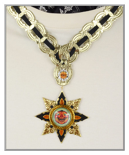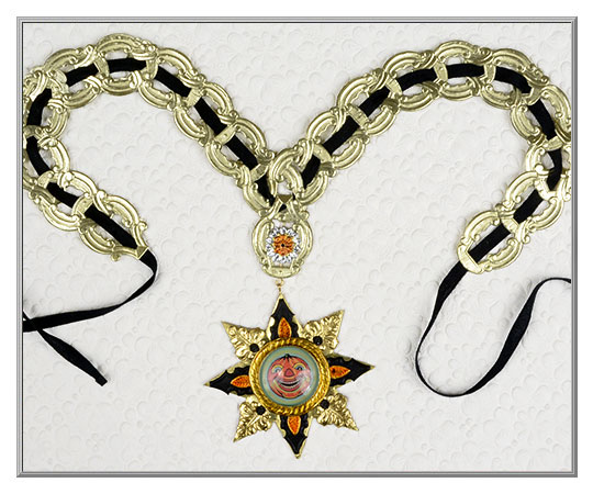 Designed and crafted with vintage and old-style materials, the Dresden chain links were produced in West Germany in the 1970's. The solid glass cabochon in the center of the amulet is encircled with fancy Dresden trims on a gold star and has a gold metal loop hanger.