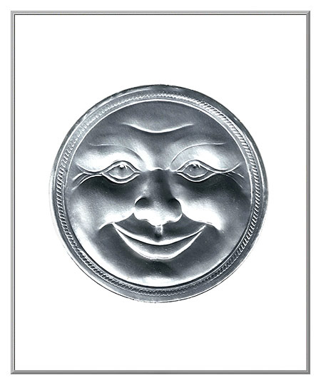 Shine on, shine on harvest moon! This round full Mr. Moon has a benevolent grin that makes him a charmer all year long. Eerie in a Halloween display, it can also be enjoyed on the boughs of a Christmas tree. Deeply embossed, the moon is made of sturdy cardboard with shiny silver foil on both sides. Made in Germany.