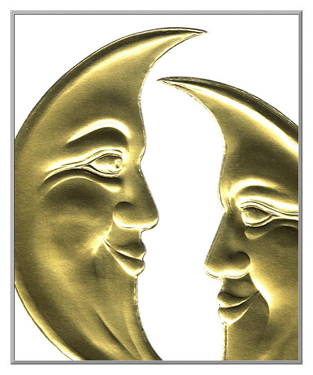Our smiling crescent man-in-the-moon Dresdens are mirror-image so you can glue them together to create a double-backed decoration. Made of cardboard, the shiny yellow gold foil is on both the front and back. A unique decoration you can enjoy all year round, these crescent moons are from Germany.