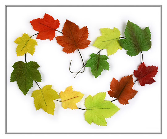Colorful maple leaves in a fun medley of Autumnal colors, these garlands can be displayed from early September thru to Thanksgiving! Nicely embossed, die-cut leaves are made of parchment paper with a waxed coating. These old-style garlands were assembled by hand using three sizes of leaves in a variety of Fall colors. Original old stock from the 1990's, the German firm that made them is no longer in business.