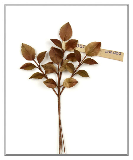 The satiny rose leaves in this delicate spray have a slight translucency, which adds to its airy appearance. Made of stiffened fabric, the embossed bronze leaves are delicately blushed with rosy pink shading. Rose stems are light brown, paper-covered wire. The original paper label still on the spray is printed "Made in Germany" and then stamped with "U.S.S.R. occupied."