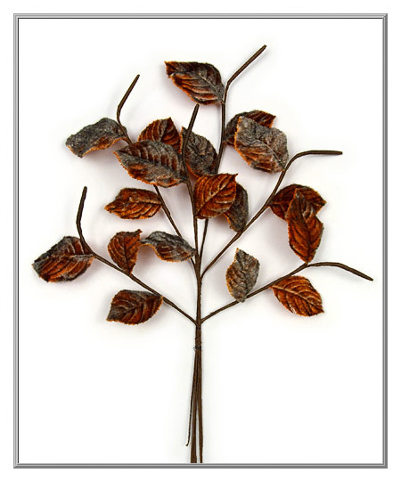 Lush leaves of thick velvet fabric make this vintage spray the perfect fall floral. Starting with orange velvet fabric, each die-cut leaf is deeply embossed and then individually shaded with a charcoal grey tint. Backs of the leaves is a solid pumpkin orange color. Wire stems are covered with brown paper. Original old paper labels still on some of the sprays is printed "Made in Germany."