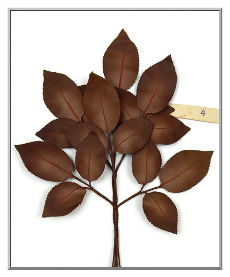 A distinctive spray of unique coloration, this charming October rose leaf spray is nearly 75 years old. Made from cotton fabric, the leaves were embossed for added detailing, then airbrushed with brown shadings to create its naturalistic look. Finished with painted midribs of rust red, the rose leaf stems are of paper-covered wire. Old stock spray still wears its original paper label that reads "Made in Germany."