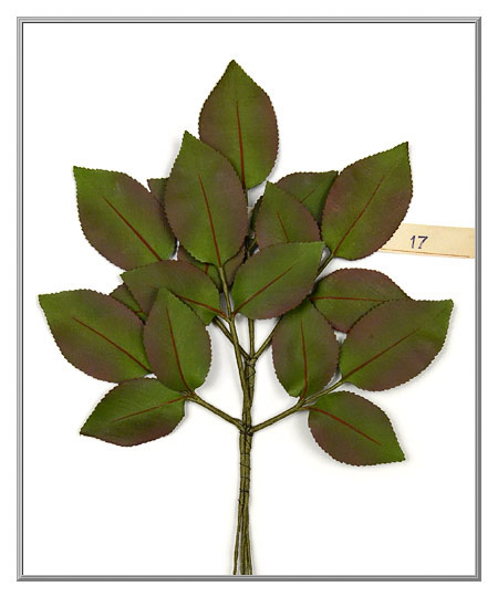 A distinctive spray of unique coloration, this charming October rose leaf spray is nearly 75 years old. Made from cotton fabric, the leaves were embossed for added detailing, then airbrushed with pink accents to create its naturalistic look. Finished with painted midribs of crimson, the rose leaf stems are of paper-covered wire. Old stock spray still wears its original paper label that reads "Made in Germany."