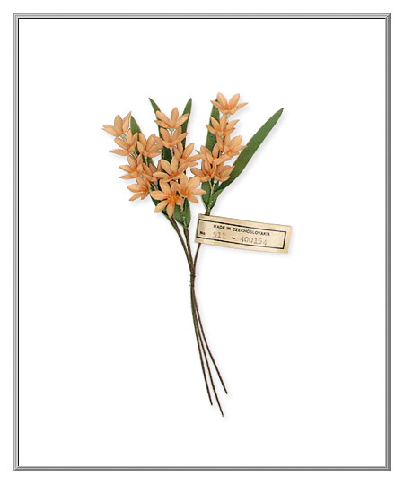 As fresh and airy as lilies found growing on a sunny hillside, this charming spray is composed of three individual sprigs. Each of these sprigs is made up of six blushed fabric flowers with two long green leaves. Stems are paper-covered wire. Lilies spray still wears the original paper label.