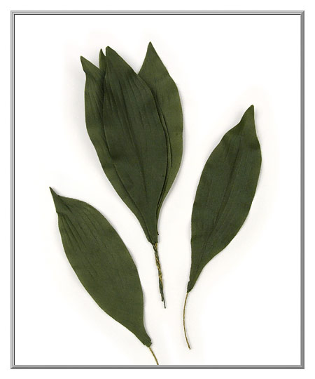 Large green leaves that are suitable to complement almost any genus of lilies, these these stiffened fabric leaves have a slight translucency which is quite nice. The embossed, moss green rayon leaves have thin wire stems. Made in Japan nearly 60 years ago, these old store stock lily leaves are in unused, like-new condition.