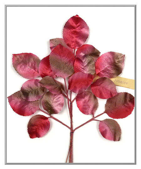 Sumptuous leaves of lustrous satin and a unique coloration combine to create a rose leaf spray of rare beauty. Pretty vintage pink leaves for making custom wedding corsages and boutonnieres, these die-cut, embossed leaves have subtle shadings of a darker blue for an elegant effect. Made with stems of blue paper-covered wire, it is still in like-new condition. Satin rose leaf spray has the original paper label which reads "Made in Germany - (East)."