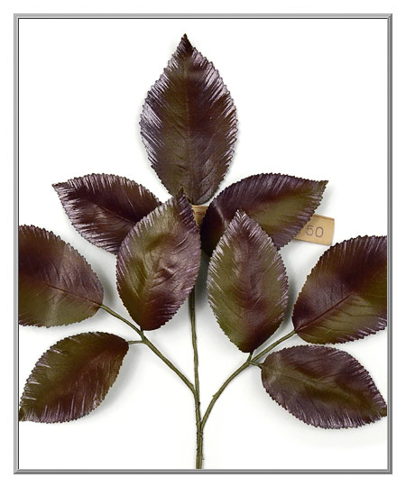 A bold spray of the largest vintage rose leaves we have ever come across, it has a striking coloration which is quite distinct. Embossed, die-cut leaves of cotton fabric were painted olive green, then airbrushed with soft shadings of dark claret. Each leaf is finished with hand-painted edging details of palest pink to create this special spray. Stems are of paper-covered wire. Rose leaf spray still wears its original paper label that reads "Made in Germany."