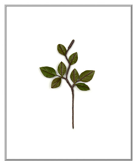This sprightly branchlet of rose leaves, although nearly 70 years old, is still in mint, like-new condition. Made using crisply embossed, stiff fabric leaves in slightly varying shades of green for a naturalistic effect, the branchlet stem is of brown paper-covered wire. Some of the sprays may come with the "Made in Japan" original paper tag.