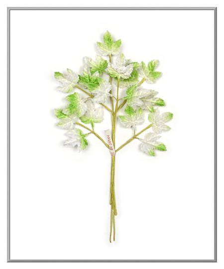 Created from velvet fabric that has a lovely sheen, the embossed, die-cut white leaves are all artistically shaded with a lime green tint. Still in unused, like-new condition, the spray has six sprigs and eighteen leaves total. Wire stems are light green paper-wrapped. Manufactured nearly 70 years ago, the leaf spray still wears its original "Made in Japan" paper tag.