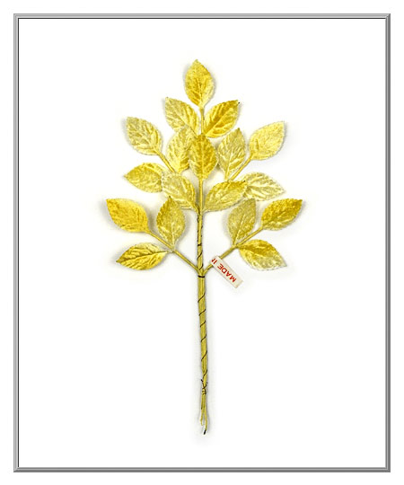 These little velvet rose leaves are great for crafters and milliners alike because the spray can be used as is, or cut apart into mini sprigs. Embossed velvet leaves are finely detailed and have a soft sheen. Wire stems are wrapped in a yellow paper. Leaf spray still wears its original old "Made in Japan" tag.