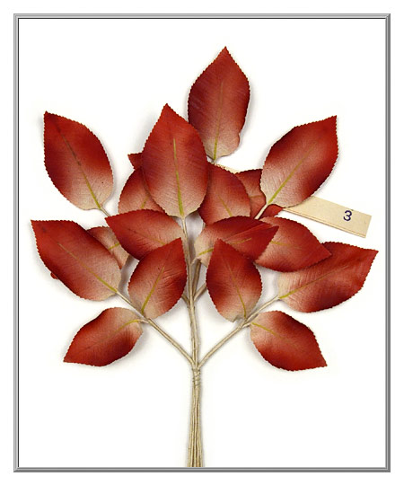 Distinctive leaves of unique coloration, this rose leaf spray is nearly 76 years old. Made from stiffened cotton fabric, the leaves were embossed for added detailing, then airbrushed with carmine shadings to create its naturalistic look. Finished with painted midribs of olivine, the rose leaf stems are of paper-covered wire. Old stock spray has the original paper label that reads "Made in Germany."