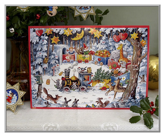 Toot! toot-toot! Santa's Christmas train is right on track, chugging along with a full delivery of treats and toys for good little boys and girls! This sweet advent calendar is sure to become an instant favorite with the little ones, because hidden behind each numbered window is a different surprise picture of an old-time toy. Highlighted with finest glittery silver sparkles, this cardboard calendar is made in Germany.