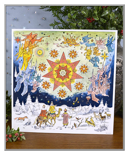 This exuberant image is a reprint of an original pictorial Advent calendar that was first issued in 1961! A divine, lively design from the mid-century, each of the 24 numbered doors open to reveal a different surprise little picture for the day. Printed on satin finish cardboard, it is sparkled with finest silver glitter. From Germany.