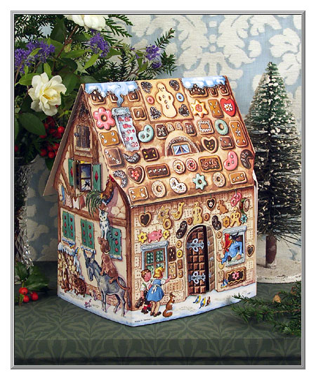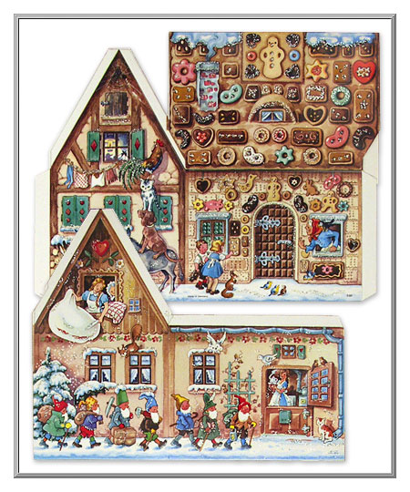 Illustrated with charming scenes from well-known fairy tales, little ones just adore this three-dimensional cottage Advent calendar, and have so much fun searching for each day's little window to open! The front and side shown at left depict scenes from "Hänsel and Gretel" and "The Bremen Town Musicians," and the back is decorated with pictures from "Frau Holle" and "Snow White and the Seven Dwarves." Highlighted with silver glitter, this cardboard house is easily assembled. From Germany.
