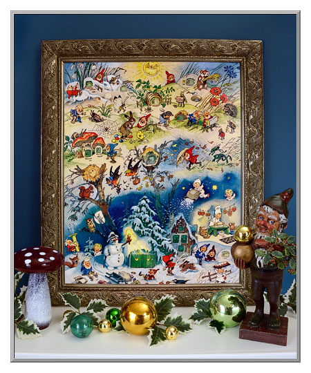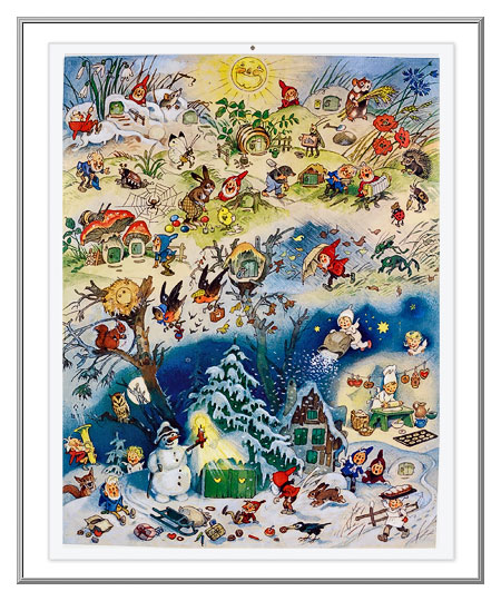 The most charming storybook picture is printed on both sides of this oversized decoration -- the front is a standard Advent calendar with numbered doors to open, while the back is printed as a wall art poster! A special gift that would be so fun for the kiddies to enjoy this Advent, when the holidays are over the poster side is suitable for framing. This Advent calendar is crisply printed in full color on satin finish cardboard. Our own import from Germany.
