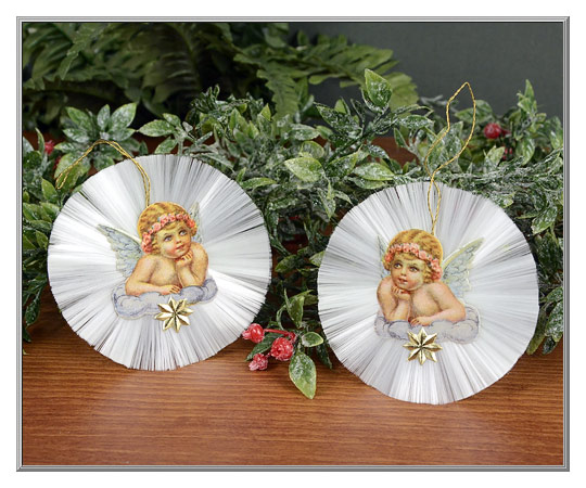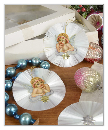 A fabulous find that we are delighted to share with other Christmas enthusiasts! Vintage ornaments that we acquired from an elderly importer back in the late 1980's, they most probably date to mid-century East Germany. Featuring a sweet cherub scrap with a gold Dresden star accent, the gleaming spun glass halos have acquired the slight aqua tint which is a sign of their advanced age. Spun glass ornaments are gift boxed.