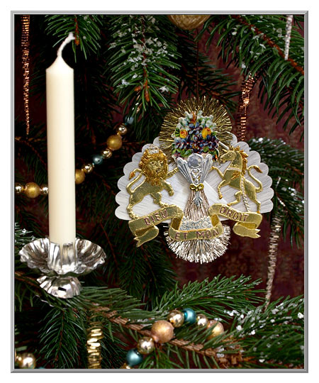 This stately medallion ornament bears the legend "Dieu et Mon Droit," which is the motto of the British Monarch in England, and is French for "God and My Right." The gilt Dresden medallion, with lion rampant and fantastical unicorn, are set upon a cartouche of white spun glass. Finished with sparking Lametta tinsel trims, each features a genuine antique flowers scrap. Please do note that the floral scraps vary on each piece, so that your collectible ornament will be one-of-a-kind. Gift boxed.