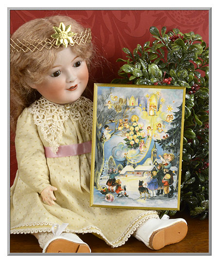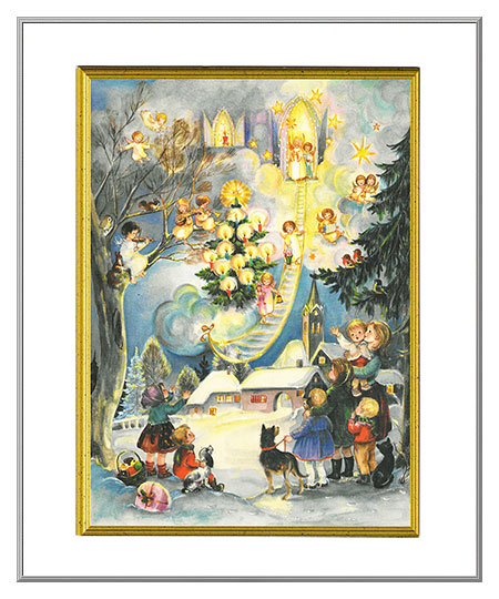 A sweet scene of little angels bringing gifts from heaven to the children below, this picture is a reprint of a vintage image that dates to the mid-century. A pretty card for young and old alike, the card is left blank inside for your special message. Our import from Germany.