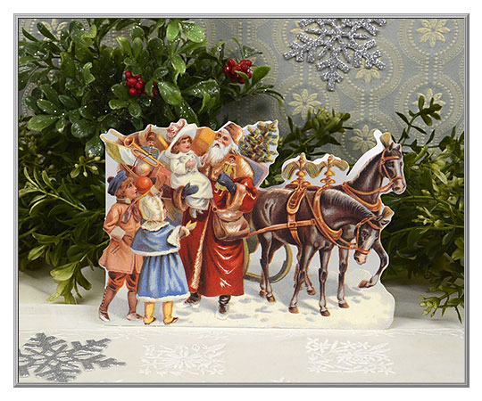 When Santa Claus wants to visit a few of his little friends, he's sure to journey to town in his own horse-drawn sleigh. This Victorian die-cut greeting card is lightly embossed and printed on a satin finish cardstock. Card is left blank inside for your own holiday message. Made in England.