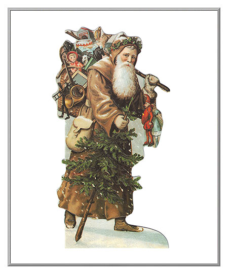 Walking with a tree and toys in hand to deliver to the little girls and boys, even a few snow flurries will not delay Father Christmas! This decorative card can be displayed standing, or why not use it in a wreath as shown? An old-fashioned die-cut and embossed greeting card, it's printed on a satin finish cardstock. The card is left blank inside for your own holiday message. Our import from England.