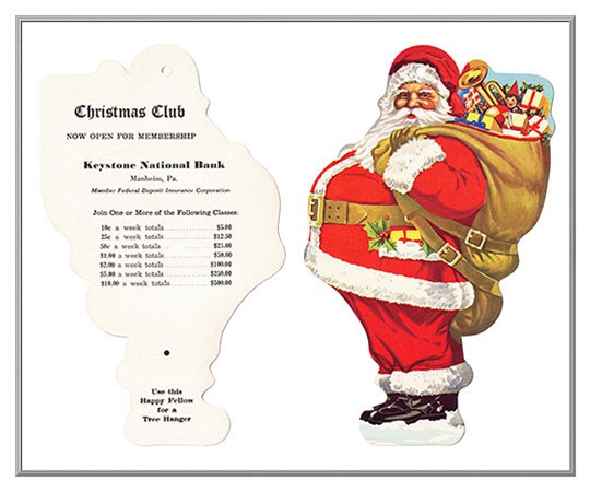 Wouldn't it be grand to "Use this Happy Fellow for a Tree Hanger"? Produced as a promotion for the Christmas Savings Club of the Keystone National Bank in Manheim, Pa., the die-cut has a small hole on top so that it can be displayed as a tree ornament. The reverse of the Santa die-cut lists all their promotional information, including costs of various levels of savings classes. Original old stock that is more than 70 years old, this cardstock die-cut is still in like-new, unused condition. Made in USA.