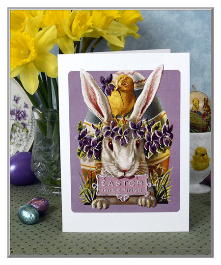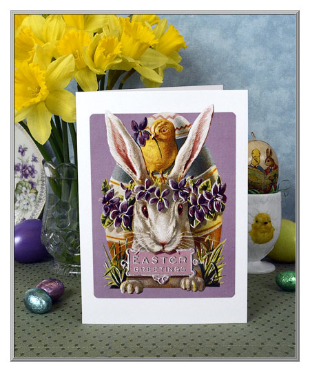 Popping out of a violets-wreathed egg, this white rabbit and his little yellow chickie friend will deliver your very best Easter greetings in style! The antique image dates to the late Victorian era, and is colorfully reproduced in pastel hues on a glossy cardstock. Card is left blank inside so that you can add your own message. Made in the U.S.A.