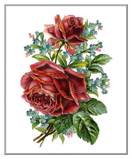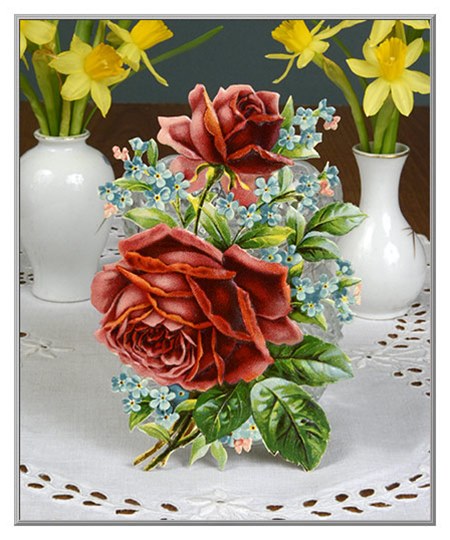 A beautiful example of the printer's art, this Victorian-era chromo is a wonderful piece of antique ephemera. Produced in 1880's England by the firm Raphael Tuck & Sons, this large scrap was one of the designs in their 'Artistic Series' line. Printed on a heavy-weight paper with finely embossed detailing, the intricate die-cut work around the blue forget-me-nots gives the scrap an airy look. This colorful English scrap is still in excellent condition.