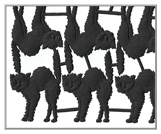 Meeoow! This hissy kitty is a frightfully cool cat for Halloween decorating. Made of matte black paper, sadly this is our final offering of these Dresdens. We found a single package in our archives with a note that reads "no longer being made - original old mold is broken". Ours from Germany.