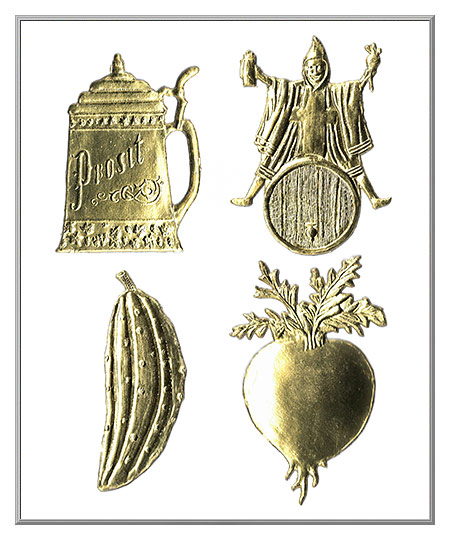 This charming set of festive Dresden die-cuts was made to order for us in Germany back in 1998. Stamped from foil-covered cardboard, the embossed die-cuts were produced on a vintage machine using the original mold. Old stock that is more than 25 years, they are still in shiny, like new condition. Our own import from Germany.