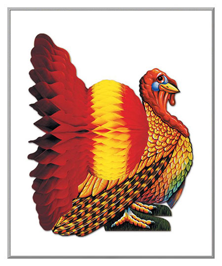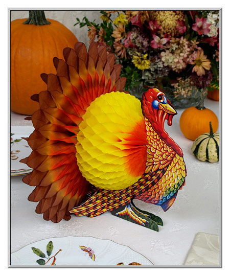 Reproduced from an original American design that dates back to the '70s, this brightly-hued turkey is printed on both sides so that it displays nicely as a table centerpiece. A charming turkey that can be enjoyed throughout the Fall season, the decoration has a fold-open honeycomb art tissue body and large fan of multi-hued tail feathers.