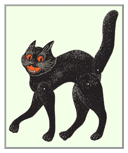 Meeooow! Headed out to make some mischief, this black cat is on the hunt for Halloween hijinks. Reproduced from the vintage 1928 design, this cutout cat decoration has metal grommets at the leg and tail joints so that it's easy to adjust the position. Crisply printed on both sides, this cardboard cutout is still produced in the U.S.A. by the original manufacturer, a party goods company that was founded in 1900.