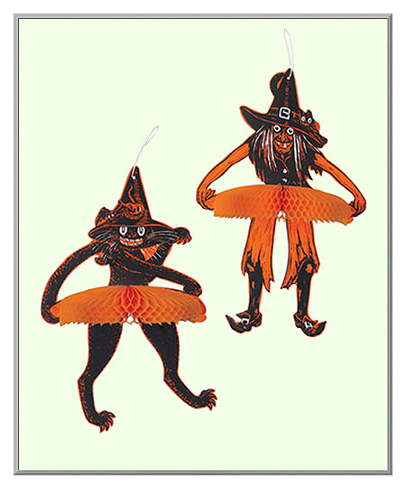 A fun pair of characters to invite to your next Halloween party, these "dancer" figures are reprinted from the vintage originals. Sporting fold-open orange art tissue honeycomb skirts, the cardboard cutouts are printed on both sides so that they will display nicely. Made in the U.S.A. by the original manufacturer.