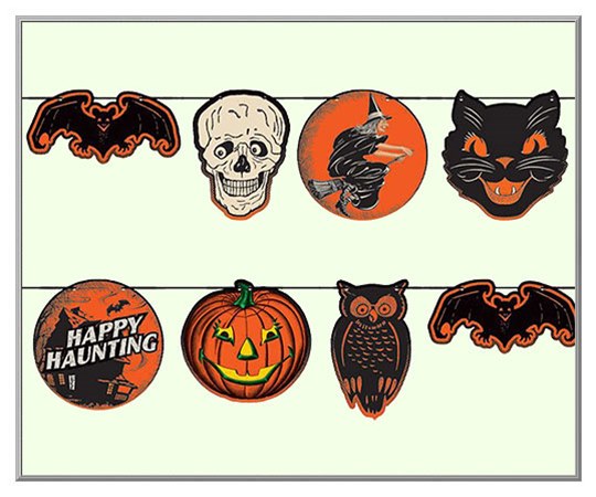 Eerie images reproduced from old-time Halloween cutouts are featured in this retro banner. A nifty decoration that's not too scary for the little ones, you can string the cardboard cutouts on the provided ribbon in an order of your own choosing. Printed on both the front and back so that it displays nicely for a party, all of the vintage images used are from originals in the archives of the original manufacturer. U.S.A.