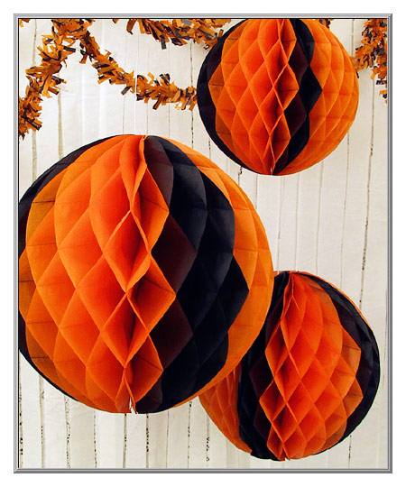 This grand tissue rosette is one of our favorite Halloween party decorations! Most commonly hung from the ceiling, chandelier or in a doorway, it's also nifty to dress up a buffet table or as a festive fireplace screen. For a dramatic, spooky atmosphere, just set a small electric light behind the tissue rosette to create a magical Halloween glow! Orange and black tissue rosette arrives flat; it easily folds open and secures with attached tabs. Made in America by a firm that was founded in 1900.
