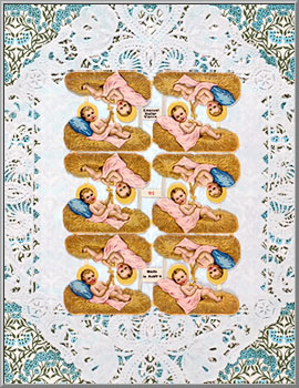 Delicate depictions of sweet Baby Jesus holding a cross, these vintage die-cuts date to the 1930's. Old store stock that is still in mint, unused condition, these scraps were produced in Vienna, Austria more than 75 years ago by the Emanuel Heller firm. Printed on standard weight paper, the embossed die-cuts have a semi-gloss finish. This full sheet is marked with "Emanuel Heller Vienna" and "Made in Austria" along with the item number "36."