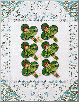 For St. Patrick's Day, may your thoughts be as glad as the shamrocks! Genuine old store stock that dates to the 1930's, these scraps are still in like-new, unused condition. Produced on a thick, sturdy paper stock and lightly embossed, they have a satin gloss lacquer finish. Original full sheets are marked with the publisher's trademark of "K & L" and "Printed in Germany."