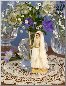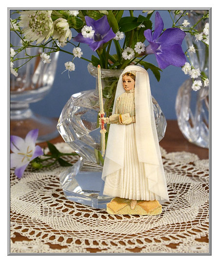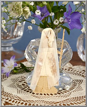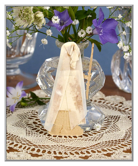 Printed by the well-know 'Luxus Papier' scrap relief company Littauer & Boysen, our "luxury paper" chromolithograph is more than 120 years old. Dressed in a super-fine parchment paper gown with veil, this L&B die-cut is from our own archives and is in original condition.